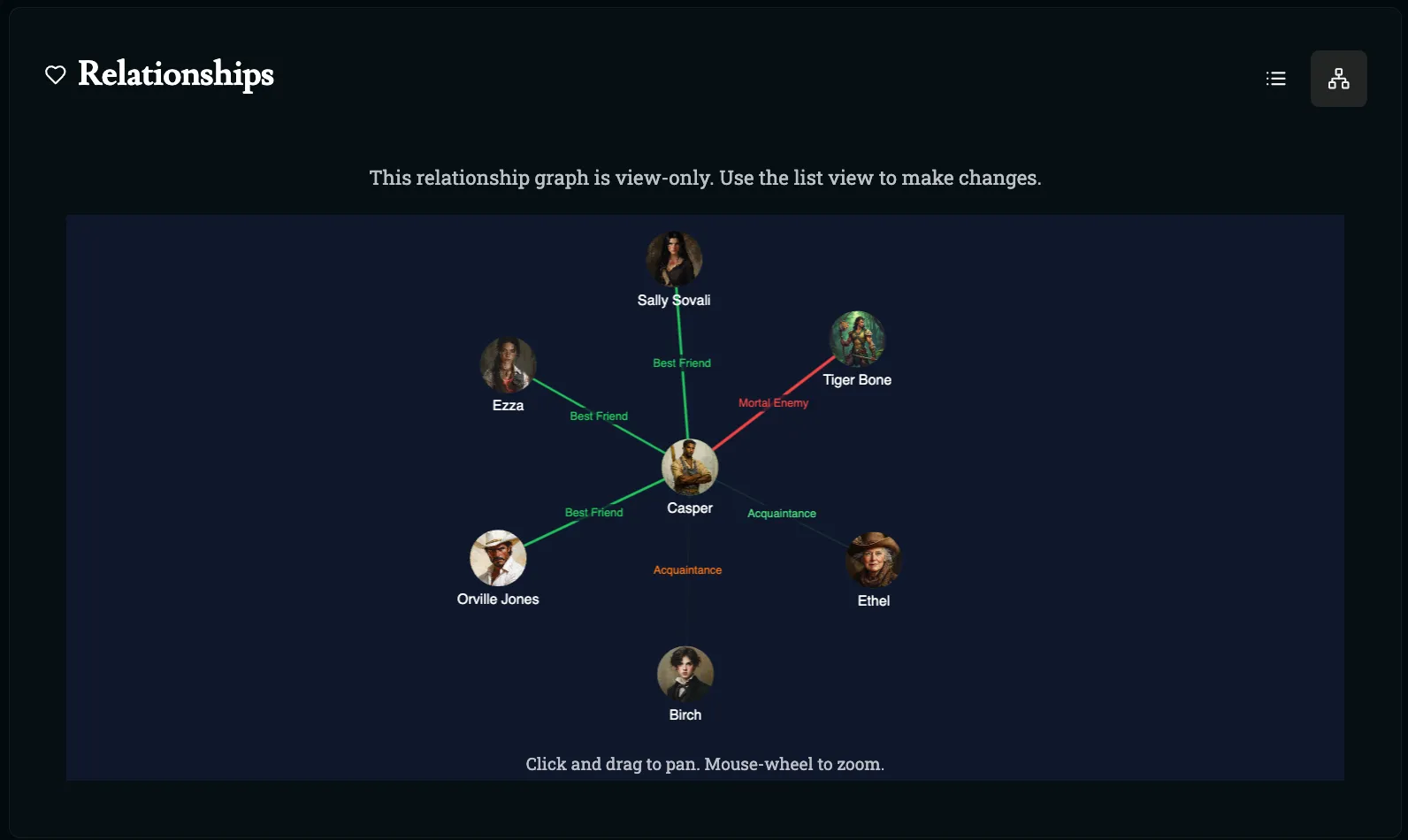 You can also view the relationship graph for any given character in the graph view; in the future we may add a graph view for the whole world so you can see how all the characters in a world are related to each other.